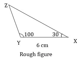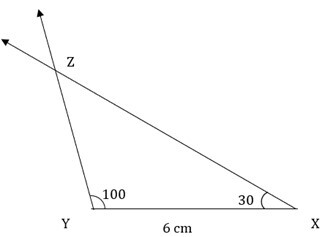 例如,構造 ΔXYZ,使得 l(YX) = 6 釐米,$\mathrm{m\angle\:ZXY\:=\:30°,\:m\angle\:ZXY\:=\:100°}$。
