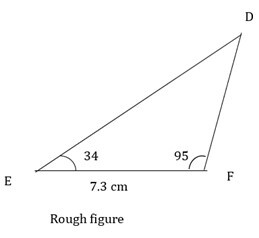 3) 在 ΔDEF 中,EF = 7.3 釐米,$\mathrm{m\angle\:E\:=\:34°,m\angle\:=\:95°}$