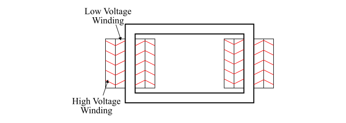 - 在實際應用中,並非將初級繞組放在一個鐵芯柱上,次級繞組放在另一個鐵芯柱上,而是將每個繞組的一半繞在其中一個鐵芯柱上,另一半繞在第二個鐵芯柱上。這確保了兩個繞組之間緊密的磁耦合。結果,變壓器的漏磁通量大大減少。