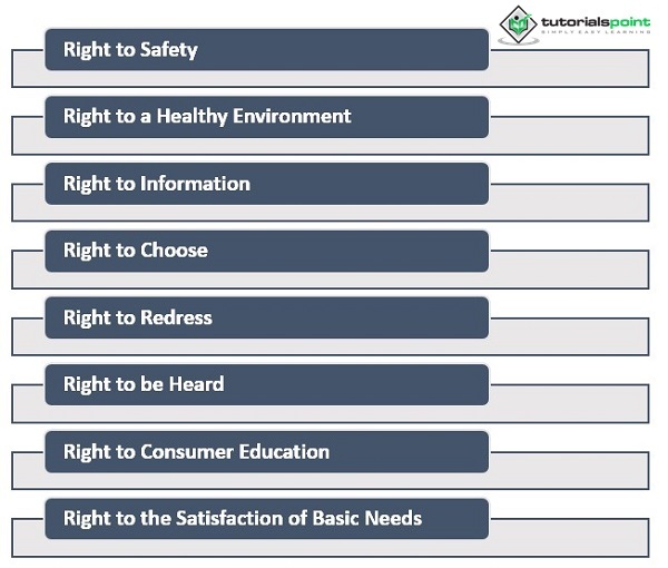 消費者權利是為了保護消費者的利益而建立的。在當今社會,消費者權利得到確立和有效執行。各國不同的政府已適當地傳達了消費者權利知識。西方世界的人們比印度和其他發展中國家(如斯里蘭卡、孟加拉國等)的人們更瞭解他們的消費者權利。只有受過教育的精英階層知道他們的消費者權利,而貧困和未受教育的階層仍然不知道他們的權利。消費者權利包括以下內容: