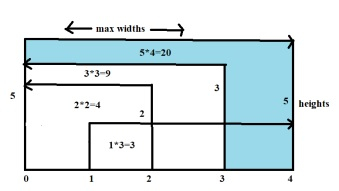 Arr[0] and Arr[4] width=4, area = Arr[0]<=Arr[4] → 5*4=20 Arr[1] and Arr[4] width=3, area = Arr[1]<=Arr[4] → 1*4=4 Arr[2] and Arr[0] or Arr[4] width=4, area = Arr[0]<=Arr[0] → 2*2=4 Arr3] and Arr[0] width=3, area = Arr[0]<=Arr[0] → 3*3=9 Arr[4] and Arr[0] width=4, area = Arr[0]<=Arr[4] → 5*4=20