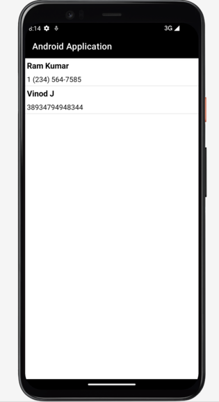說明 - 在上面的程式碼中,首先我們為列表檢視建立變數。在 onCreate 方法中,我們使用我們在 activity_main.xml 檔案中給出的 ID 初始化列表檢視變數。之後,我們建立並初始化遊標變數,然後透過呼叫 startManagingCursor 方法設定遊標的管理器。之後,我們建立一個字串陣列來獲取聯絡電話號碼和聯絡人姓名。然後,我們建立一個整數陣列,在其中指定我們必須設定資料的文字檢視的 ID。然後我們建立並初始化我們的介面卡,並將資料傳遞給它。最後,我們將介面卡設定為我們的列表檢視。