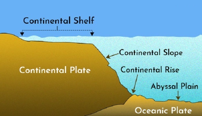 大陸架是大陸邊緣的一部分,被淹沒且坡度平緩。它的寬度從海岸線延伸到陸架邊緣,海底在那裡開始變得更加陡峭。