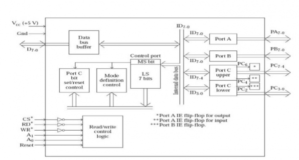 這兩個都只寫入控制埠。從微處理器的角度來看,只有一個 8 位控制埠,當 CS*=0,WR*=0,A1=1 和 A0=1 時被選中。但是如果我們考慮 8255 的架構,內部有兩個控制埠,一個用於模式定義控制,另一個用於埠 C 位設定/復位控制。如果控制埠的 MS 位 = 1,則控制埠的內容被鎖存到模式定義控制埠中。如果控制埠的 MS 位 = 0,則控制埠的內容被鎖存到埠 C 位設定/復位控制埠中。這可以從下圖看出。