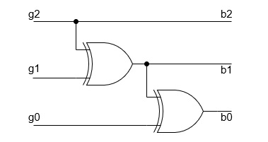 類似地,您可以將n位(bnb(n-1)...b2b1b0)二進位制數轉換為格雷碼(gng(n-1)...g2g1g0)。對於最低有效位(LSB),bn=gn,b(n-1)=g(n-1)⊕gn,…. b1=g1⊕g2⊕g3...⊕gn,以及b0=g0⊕g1⊕g2⊕g3...⊕gn。