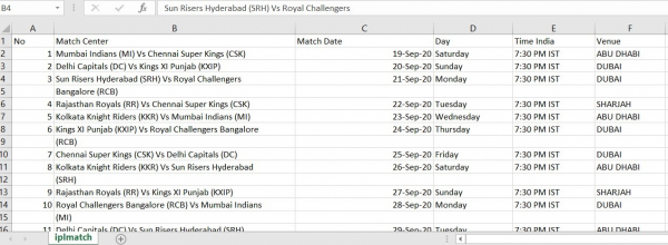 在這個示例中,我們使用了 **IPL 比賽日程文件** 並將其轉換為 Excel 檔案。