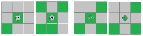 **過度繁殖:** 如果一個細胞周圍有超過三個活細胞,則該細胞死亡。