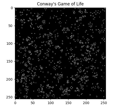 #Import required library import numpy as np import matplotlib.pyplot as plt import argparse import time #------------------------------------------------------------------------- class Board(object): def __init__(self, size, seed = 'Random'): if seed == 'Random': self.state = np.random.randint(2, size = size) self.engine = Engine(self) self.iteration = 0 def animate(self): i = self.iteration im = None plt.title("Conway's Game of Life") while True: if i == 0: plt.ion() im = plt.imshow(self.state, vmin = 0, vmax = 2, cmap = plt.cm.gray) else: im.set_data(self.state) i += 1 self.engine.applyRules() print('Life Cycle: {} Birth: {} Survive: {}'.format(i, self.engine.nBirth, self.engine.nSurvive)) plt.pause(0.01) yield self #------------------------------------------------------------------------- class Engine(object): def __init__(self, board): self.state = board.state def countNeighbors(self): state = self.state n = (state[0:-2,0:-2] + state[0:-2,1:-1] + state[0:-2,2:] + state[1:-1,0:-2] + state[1:-1,2:] + state[2:,0:-2] + state[2:,1:-1] + state[2:,2:]) return n def applyRules(self): n = self.countNeighbors() state = self.state birth = (n == 3) & (state[1:-1,1:-1] == 0) survive = ((n == 2) | (n == 3)) & (state[1:-1,1:-1] == 1) state[...] = 0 state[1:-1,1:-1][birth | survive] = 1 nBirth = np.sum(birth) self.nBirth = nBirth nSurvive = np.sum(survive) self.nSurvive = nSurvive return state #------------------------------------------------------------------------- def main(): ap = argparse.ArgumentParser(add_help = False) # Intilialize Argument Parser ap.add_argument('-h', '--height', help = 'Board Height', default = 256) ap.add_argument('-w', '--width', help = 'Board Width', default = 256) args = vars(ap.parse_args()) # Gather Arguments bHeight = int(args['height']) bWidth = int(args['width']) board = Board((bHeight,bWidth)) for _ in board.animate(): pass #------------------------------------------------------------------------- if __name__ == '__main__': main()