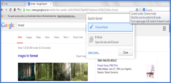 它在瀏覽器的位址列中顯示谷歌 Chrome 瀏覽器圖示,表明 CoolNova 處於“Chrome”模式,使用者可以透過點選它切換到 Internet Explorer 模式。