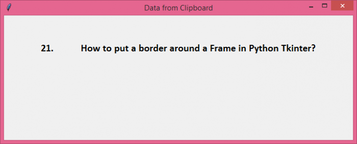 # Import the tkinter library from tkinter import * # Instance of tkinter canvas win = Tk() win.geometry("700x250") win.title("Data from Clipboard") # Get the data from the clipboard cliptext = win.clipboard_get() # Label to print clipboard text lab=Label(win, text = cliptext, font=("Calibri",15,"bold")) lab.pack(padx=20, pady=50) # Run the mainloop win.mainloop()