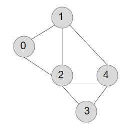 insert(graph_list, 0, 1); insert(graph_list, 0, 2); insert(graph_list, 1, 2); insert(graph_list, 1, 4); insert(graph_list, 2, 4); insert(graph_list, 2, 3); insert(graph_list, 3, 4);
