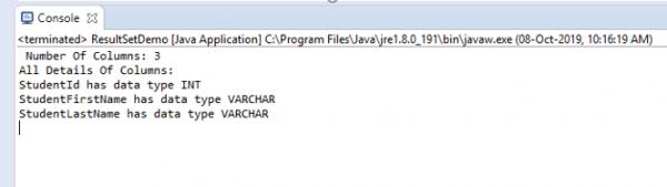 import java.sql.Connection; import java.sql.DriverManager; import java.sql.PreparedStatement; import java.sql.ResultSet; import java.sql.Statement; import com.mysql.jdbc.ResultSetMetaData; public class ResultSetDemo { public static void main(String[] args) { Connection con = null; PreparedStatement ps = null; Statement st = null; ResultSet rs = null; try { con = DriverManager.getConnection("jdbc:mysql://:3306/web?useSSL=false", "root", "123456"); String query = "select StudentId,StudentFirstName,StudentLastName from DemoTable"; st = con.createStatement(); rs = st.executeQuery(query); ResultSetMetaData rsmd = (ResultSetMetaData) rs.getMetaData(); int numberOfColumn = rsmd.getColumnCount(); System.out.println(" Number Of Columns: " + numberOfColumn); System.out.println("All Details Of Columns:"); for (int i = 1; i <= numberOfColumn; i++) { String columnName = rsmd.getColumnName(i); String dataTypeOfColumn = rsmd.getColumnTypeName(i); System.out.println(columnName + " has data type " + dataTypeOfColumn); } } catch (Exception e) { e.printStackTrace(); } } }