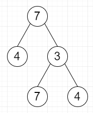 TreeNode *root = new TreeNode(7); root->left = new TreeNode(4); root->right = new TreeNode(3); root->right->left = new TreeNode(7); root->right->right = new TreeNode(5);