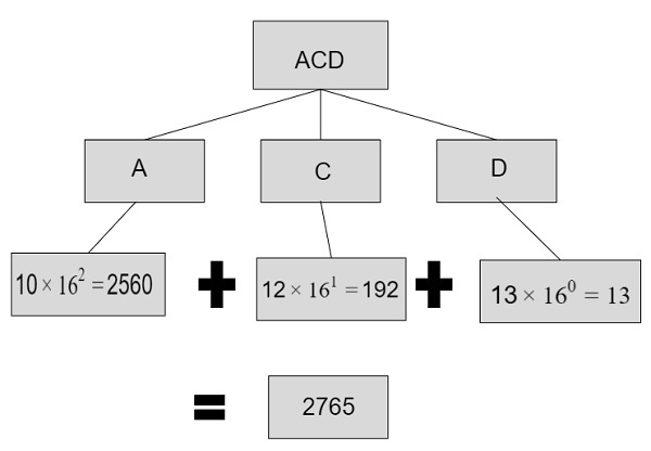 Input-: ACD A(10) will be converted to a decimal number by -: 10 X 16^2 = 2560 C(12) will be converted to a decimal number by -: 12 X 16^1 = 192 D(13) will be converted to a decimal number by -: 13 X 16^0 = 13 Output-: total = 13 + 192 + 2560 = 2765