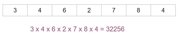 Output-: 3 x 4 x 6 x 2 x 7 x 8 x 4 = 32256下面程式中用到的方法如下 -
