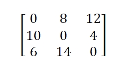 Enter no of vertices: 3 Enter no of edges: 5 Enter the EDGE Costs: 1 2 8 2 1 12 1 3 22 3 1 6 2 3 4 Resultant adj matrix 0 8 12 10 0 4 6 14 0
