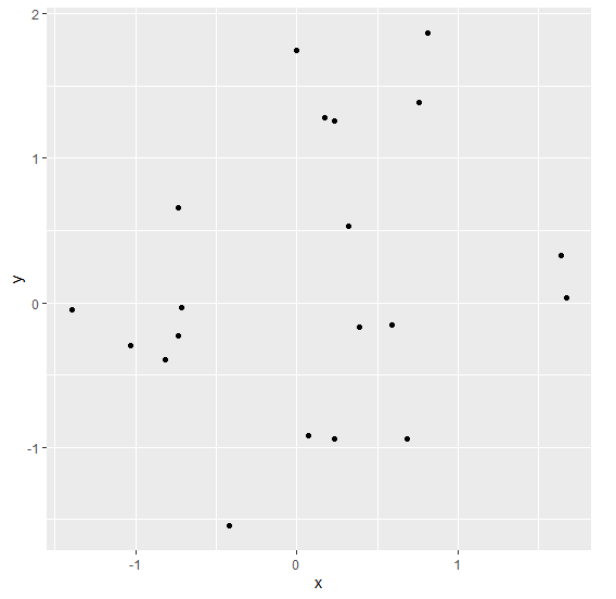x<-rnorm(20) y<-rnorm(20) df<-data.frame(x,y) library(ggplot2) ggplot(df,aes(x,y))+geom_point()