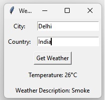 此函式從輸入欄位獲取城市和國家/地區,使用API金鑰、城市和國家/地區構建API請求URL,發出API請求,並從JSON響應中提取相關的天氣資料。然後,它將溫度和天氣描述顯示在GUI中的相應標籤中。