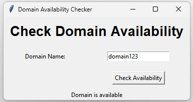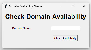 執行程式碼後,您應該會看到一個 GUI 視窗,其中包含標題、標籤和輸入欄位以輸入域名、“檢查可用性”按鈕以及一個標籤以顯示可用性狀態。輸入域名並單擊按鈕後,可用性狀態將顯示在標籤部件中。