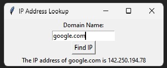 result_label.config(text="The IP address of {} is {}".format(domain, ip_address))