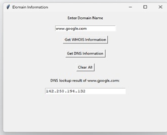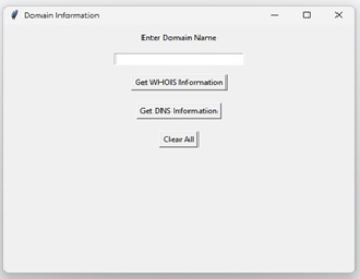 程式建立三個按鈕 - “獲取WHOIS資訊”、“獲取DNS資訊”和“全部清除”。單擊“獲取WHOIS資訊”按鈕時,它將呼叫get_whois_info()函式。同樣,單擊“獲取DNS資訊”按鈕時,它將呼叫get_dns_info()函式。最後,單擊“全部清除”按鈕時,它將呼叫clear()函式。