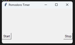 # importing the essential libraries for our work import tkinter as tk import time from datetime import datetime, timedelta # Create a GUI window root = tk.Tk() root.title("Pomodoro Timer") # Set the window size and position window_width = 300 window_height = 150 screen_width = root.winfo_screenwidth() screen_height = root.winfo_screenheight() x_cordinate = int((screen_width / 2) - (window_width / 2)) y_cordinate = int((screen_height / 2) - (window_height / 2)) root.geometry("{}x{}+{}+{}".format(window_width, window_height, x_cordinate, y_cordinate)) # Current Time Label current_time_label = tk.Label(text="", font=("Helvetica", 20)) current_time_label.pack() # Timer Label timer_label = tk.Label(text="", font=("Helvetica", 30)) timer_label.pack() # Start Button start_button = tk.Button(text="Start", font=("Helvetica", 10)) start_button.pack(side="left") # Stop Button stop_button = tk.Button(text="Stop", font=("Helvetica", 10)) stop_button.pack(side="right") # This code snippet is used to understand the start Button Functionality def start_timer(): current_time_label.config(text=time.strftime("%H:%M:%S")) timer_label.config(text="25:00") start_button.config(state="disabled") stop_button.config(state="normal") # This code snippet is used to understand the stop Button Functionality def stop_timer(): timer_label.config(text="") start_button.config(state="normal") stop_button.config(state="disabled") # This code snippet is used to understand the timer Functionality def countdown(minutes): seconds = minutes * 60 while seconds > 0: minutes, sec = divmod(seconds, 60) timer_label.config(text='{:02d}:{:02d}'.format(minutes, sec)) time.sleep(1) seconds -= 1 timer_label.config(text="Time's up!") start_button.config(state="normal") stop_button.config(state="disabled") # this piece of code is used to connect the start and stop button to make it easier start_button.config(command=lambda: (start_timer(), countdown(25))) stop_button.config(command=stop_timer)
