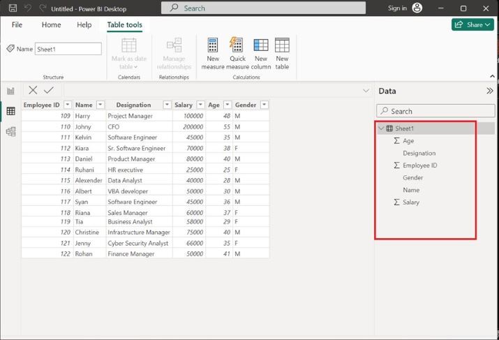 開啟 Power BI 桌面並載入包含六列的 Sheet1 表格,這些列名為**年齡、職位、員工 ID、性別、姓名和薪資**。Sheet1 表格的完整結構和條目如下所示: