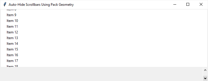 import tkinter as tk def on_canvas_configure(event): ---------- ---------- def check_scrollbar_visibility(): ---------- ---------- def on_mousewheel(event): ---------- ---------- # Create Tkinter window root = tk.Tk() root.title("Auto-Hide Scrollbars Using Pack Geometry") # Set window dimensions root.geometry("720x250") # Create a canvas canvas = tk.Canvas(root, bg="white", width=300, height=200, scrollregion=(0, 0, 500, 500)) canvas.pack(expand=True, fill="both") # Create vertical scrollbar y_scrollbar = tk.Scrollbar(root, orient="vertical", command=canvas.yview) # Create horizontal scrollbar x_scrollbar = tk.Scrollbar(root, orient="horizontal", command=canvas.xview) # Configure canvas to use the scrollbars canvas.configure(yscrollcommand=y_scrollbar.set, xscrollcommand=x_scrollbar.set) # Bind events canvas.bind("<Configure>", on_canvas_configure) canvas.bind("<MouseWheel>", on_mousewheel) # Initial check for scrollbar visibility check_scrollbar_visibility() # Add some content to the canvas for i in range(50): canvas.create_text(20, 20 * i, text=f"Item {i+1}", anchor="w") # Start the Tkinter event loop root.mainloop()