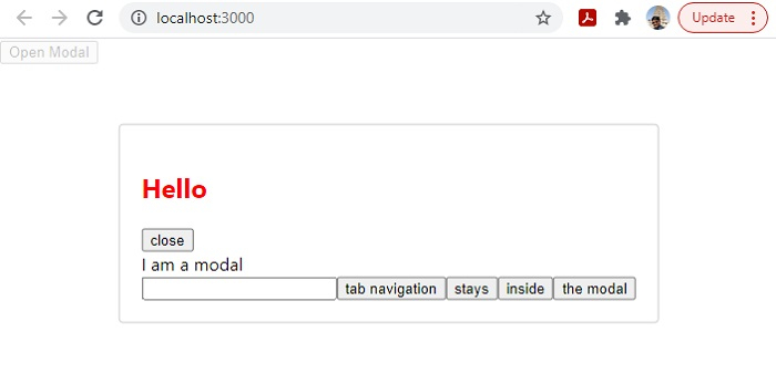 概念很簡單。點選按鈕時,**狀態**更改為 **true**,當為 **true** 時,模態框開啟。在模態框上,有一個按鈕,點選該按鈕會將狀態更改為 **false** 並關閉模態框。