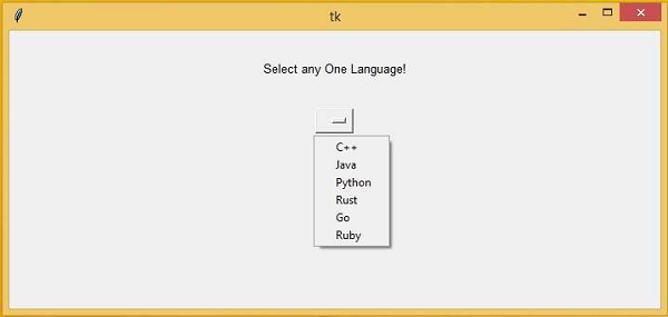 main_menu = OptionMenu(win, clicked, "C++", "Java", "Python", "Rust","Go","Ruby")