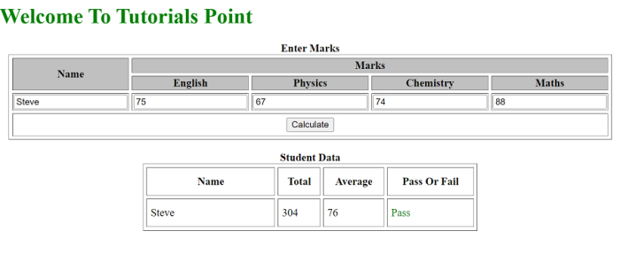 <!DOCTYPE html> <html> <body> <h1 style="color: green;"> Welcome To Tutorials Point </h1> <center> <table border="1" cellspacing="5" bgcolor="white"> <caption><b>Enter Marks</b></caption> <tr style="background: silver;"> <th rowspan="2">Name</th> <th colspan="4">Marks</th> </tr> <tr style="background: silver;"> <th>English</th> <th>Physics</th> <th>Chemistry</th> <th>Maths</th> </tr> <tr> <td><input type="text" id="name"></td> <td><input type="text" id="english"></td> <td><input type="text" id="physics"></td> <td><input type="text" id="chem"></td> <td><input type="text" id="maths"></td> </tr> <tr> <th colspan="5" height="30"> <input type="submit" value="Calculate" onclick="Sub()"></th> </tr> </table> <br> <table border="1" cellspacing="5" bgcolor="white" height="100" width="500" cellpadding="5" id="TableScore"> <caption><b>Student Data</b></caption> <tr> <th width="180">Name</th> <th>Total</th> <th>Average</th> <th>Pass Or Fail</th> </tr> </table> </center> <script type="text/javascript"> function Sub(){ var n, k, r, e, v, sum, avg; n=(document.getElementById('name').value); eng=parseFloat(document.getElementById('english').value); phy=parseFloat(document.getElementById('physics').value); chem=parseFloat(document.getElementById('chem').value); maths=parseFloat(document.getElementById('maths').value); // Calculating the Total Marks sum=eng+phy+chem+maths; avg=sum/4; // Displaying the Student Data var newTable = document.getElementById('TableScore'); var row = newTable.insertRow(-1); var cell1 = row.insertCell(0); var cell2 = row.insertCell(0); var cell3 = row.insertCell(0); var cell4 = row.insertCell(0); cell4.innerHTML= n; cell3.innerHTML=sum; cell2.innerHTML = avg; if(avg>=33){ cell1.innerHTML="<font color=green>Pass</font>"; } else { cell1.innerHTML="<font color=red>Fail</font>"; } } </script> </body> </html>