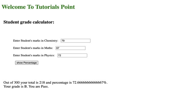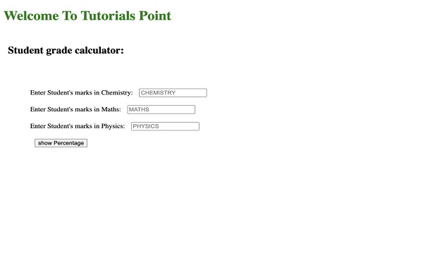 <!DOCTYPE html> <html> <head> <title>Student Grade Calculator</title> <!-- link for font --> <link href= "https://fonts.googleapis.com/css family=Righteous&display=swap"rel="stylesheet"/> <link rel="stylesheet" href="styles.css" /> </head> <body> <!-- main html --> <h1 style="color: green"> Welcome To Tutorials Point </h1> <div class="container"> <h2>Student grade calculator:</h2> <div class="screen-body-item"> <div class="app"> <div class="form-group"> <!-- option for taking the input --> Enter Student's marks in Chemistry: <input type="text" class="form-control" placeholder="CHEMISTRY" id="chemistry" /> </div> <div class="form-group"> Enter Student's marks in Maths: <input type="text" class="form-control" placeholder="MATHS" id="maths" /> </div> <div class="form-group"> Enter Student's marks in Physics: <input type="text" class="form-control" placeholder="PHYSICS" id="phy" /> </div> <div> <input type="button" value="show Percentage" class="form-button" onclick="calculate()" /> </div> </div> </div> <!-- for showing the result--> <div class="form-group showdata"> <p id="showdata"></p> </div> </div> <!--adding external javascript file--> <script src="script.js"></script> </body> </html>