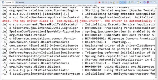 在這裡,Hibernate 會自動建立表 demo88。 application.properties 程式碼如下 −