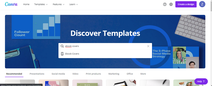 你將被定向到一個包含不同模板選項的頁面。你現在可以在搜尋欄中搜索**電子書封面**模板。