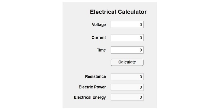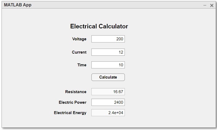 現在,為了更多地瞭解 MATLAB App Designer 中的應用程式設計,讓我們設計一個簡單的計算器應用程式,該應用程式可以計算電路中的電阻、電功率和電能。