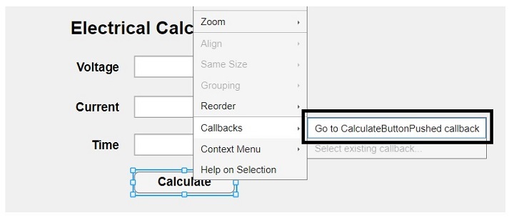**步驟 (3)** – 編寫 MATLAB 程式碼以在單擊“計算”按鈕時執行電阻、電功率、電能的計算。