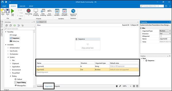 UiPath Studio 中的引數可以透過多種方式建立,例如通用值、文字、整數、資料表、物件或布林值。引數提供明確的指令來指導程式將資訊儲存在何處,這是它們的一個重要方面。輸入、輸出、輸入/輸出和屬性都是可能的指令。
