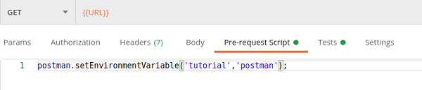 我們可以在 Postman 中使用請求前指令碼建立變數。我們可以在執行實際請求之前設定、更新或清除變數。要設定環境變數,我們必須在請求前指令碼選項卡下新增以下指令碼。