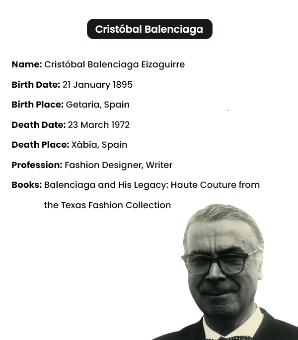 克里斯托瓦爾·巴倫西亞加是一位西班牙時裝設計師,他設計出優雅的晚禮服和其他永恆的風格。他於1895年1月21日出生於西班牙的蓋塔里亞,並於1972年3月23日去世於巴倫西亞。在他10歲的時候,他的父親——一位船長去世後,母親不得不開始縫紉來維持生計,巴倫西亞加開始認真學習裁縫。15歲時,他第一次去巴黎的旅行激勵他追求時尚事業,到20歲時,他在西班牙時尚度假勝地聖塞瓦斯蒂安擁有了自己的裁縫店。