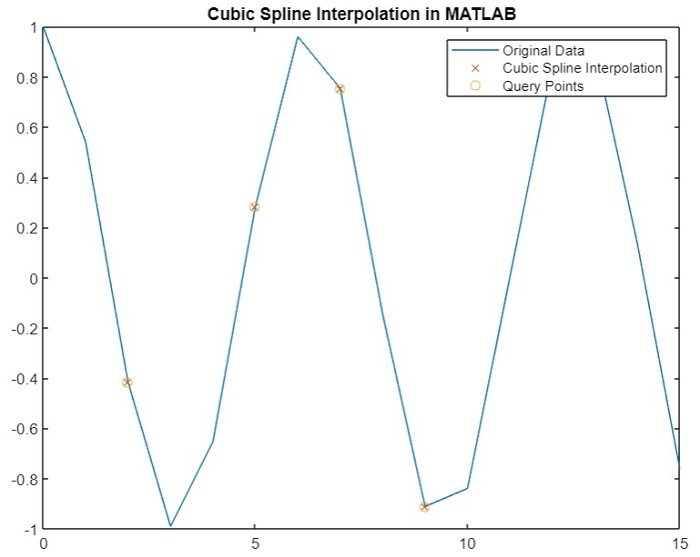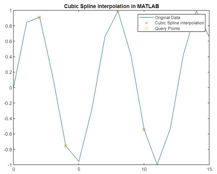 legend('Original Data', 'Cubic Spline Interpolation', 'Query Points');