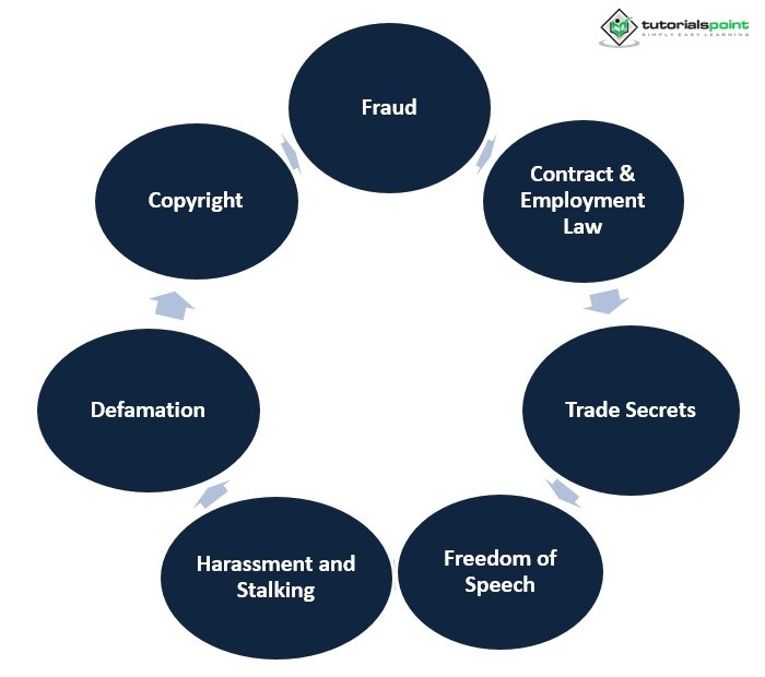 誹謗 − 許多員工使用網際網路表達自己。在網上傳播虛假資訊可能會構成誹謗。誹謗法是民法,保護人們免受可能損害個人或企業聲譽的虛假公開宣告。誹謗法指的是個人使用網際網路發表根據民法非法的主張。