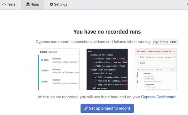 現在讓我們開始設定 Cypress 儀表盤配置。首先,我們必須在測試執行程式視窗中導航到“執行”選項卡。