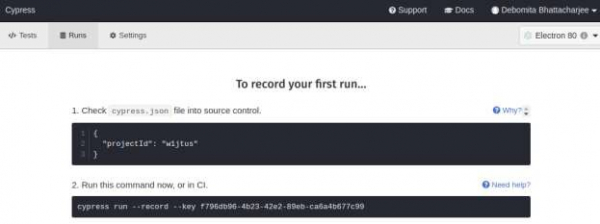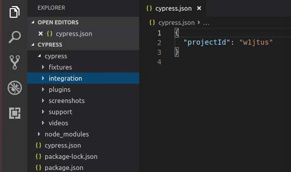 專案 ID 也將在框架中的 `cypress.json` 檔案中預設填充。因此,我們可以在設定專案後使用 Cypress 給出的建議進行驗證。