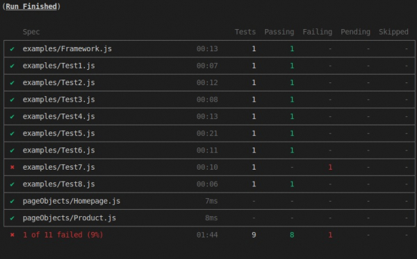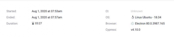 顯示總執行報告。將顯示規範數量、透過、失敗或跳過的測試用例數量。測試結果、所有測試用例的影片、螢幕截圖(對於失敗的測試)和輸出也將可用。