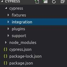 Cypress 預設情況下會為我們的專案建立一些資料夾和示例,例如**cypress**資料夾。在此 cypress 資料夾下,有多個資料夾,如 fixtures、integration、plugins、support 等。