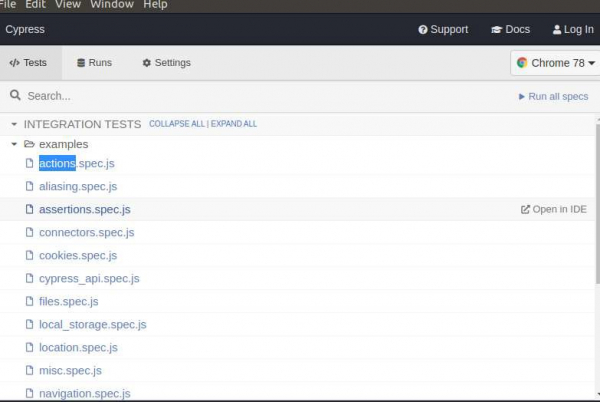 它預設情況下為我們建立了一個框架模板。現在,如果我們開啟測試執行器視窗,我們將獲得 Cypress 已為我們建立的測試用例集合。