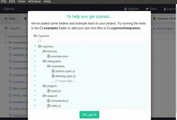 接下來,我們將從專案路徑執行命令**node_modules/.bin/cypress open**。執行此命令後,使用者將收到通知,告知 Cypress 正在機器上首次執行。執行完成後,Cypress 測試執行器將開啟。
