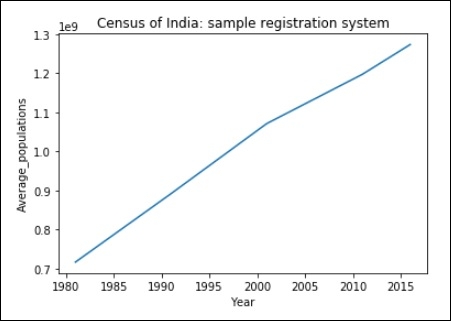 import matplotlib.pyplot as plt years = [1981, 1991, 2001, 2011, 2016] Average_populations = [716493000, 891910000, 1071374000, 1197658000, 1273986000] plt.plot(years, Average_populations) plt.title("Census of India: sample registration system") plt.xlabel("Year") plt.ylabel("Average_populations") plt.show()