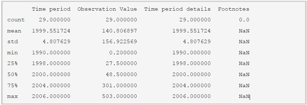 # importing pandas package import pandas as pd # importing the data using pd.read_csv() method data = pd.read_csv('CountryData.IND.csv') # no. of rows and columns print(data.describe())