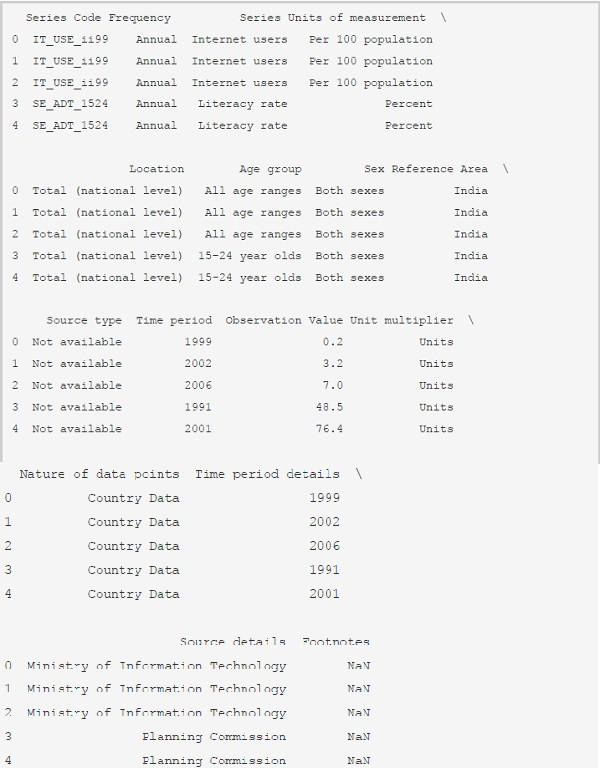 # importing pandas package import pandas as pd # importing the data using pd.read_csv() method data = pd.read_csv('CountryData.IND.csv') # displaying the first 5 rows using data.head() method print(data.head())